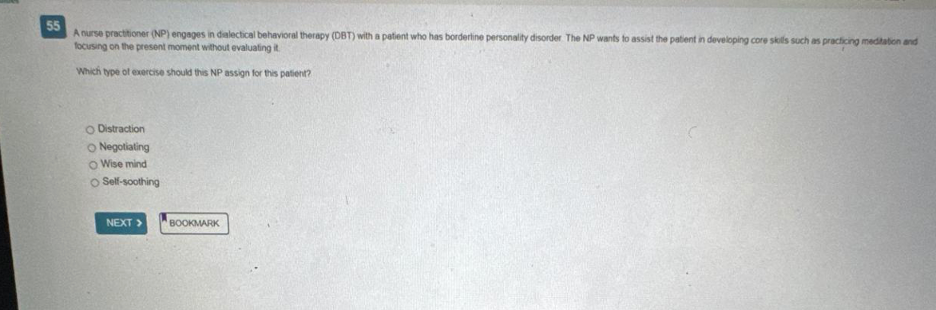 A nurse practitioner (NP) engages in dialectical behavioral therapy (DBT) with a patient who has borderline personality disorder. The NP wants to assist the patient in developing core skills such as practicing meditation and focusing on the present moment without evaluating it.